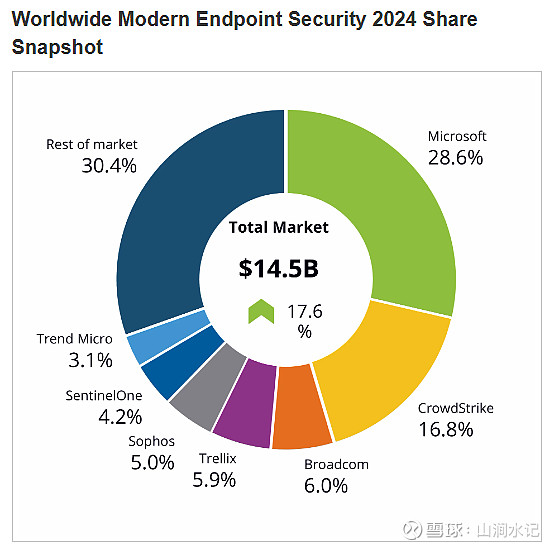 我们当下的智能终端以电脑和手机为主,据IDC数据显示,2024年全球终端保护软件市场规模约为145亿美元,其中微软和Crowdstrike分别占据28.6%和16.8%的市场份额。由于windows系统由微软开发,因此Windows系统内置的网络安全解决方案占据了领先优势。对于我国网安企业来说,在智能终端网安领域有两个机会,第一,国产系统麒麟与鸿蒙的崛起会带来电脑、手机终端的网安增量;第二,随着智能汽车、无人机、机器人等新型智能终端的发展(中国在这些领域占据技术优势,大概率诞生全球龙头),可以预见这些领域也将带来巨大的终端保护软件市场增量,在这些新兴领域有望诞生中国的微软和Crowdstrike级别的网络安全龙头,需要密切关注提前布局的相关企业。