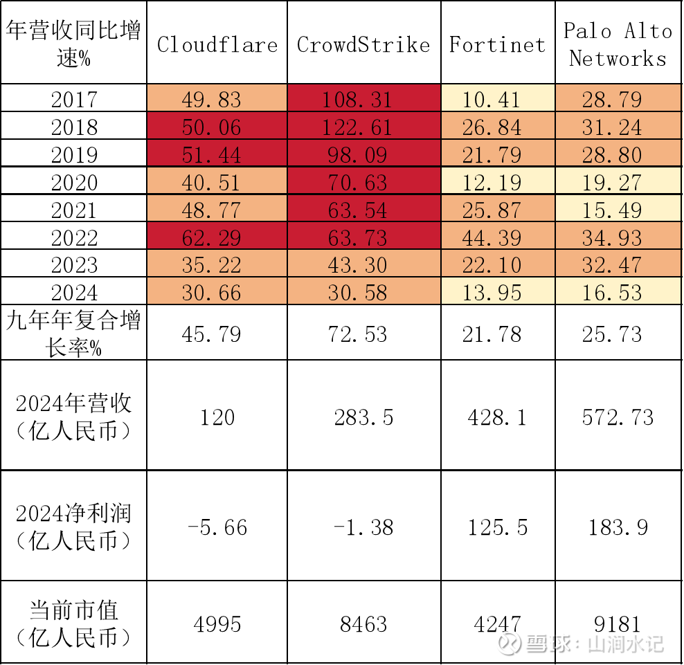 这个技术领先性分两点。一是目前市场在从合规驱动转向价值驱动,能够提供有效可靠网安产品,为客户创造真实价值的公司具备核心竞争力。二是随着人工智能等技术发展,对网络安全提出新的挑战,在AI安全、数据安全、云原生安全等新兴领域领先公司,相较于传统提供防火墙、硬件网络安全厂商更具备优势。这个一点从全球网安龙头企业估值上能印证,将做云原生平台的CrowdStrike与传统网安巨头Fortinet对比,虽然后者营收更高,净利润更是远超前者,但CrowdStrike的估值近乎是Fortinet的两倍。