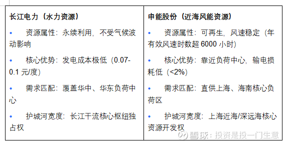 长江电力的水力资源具有不可再生但永续利用的属性,而申能股份占据的上海近海风能资源,同样具备“排他性”特质——上海近海海域规划风电装机容量有限,申能作为上海本土能源龙头,已锁定核心开发权。两者的资源护城河本质上都是“稀缺性+需求刚性”,只是能源形态从水力升级为新能源,具体对比如下: