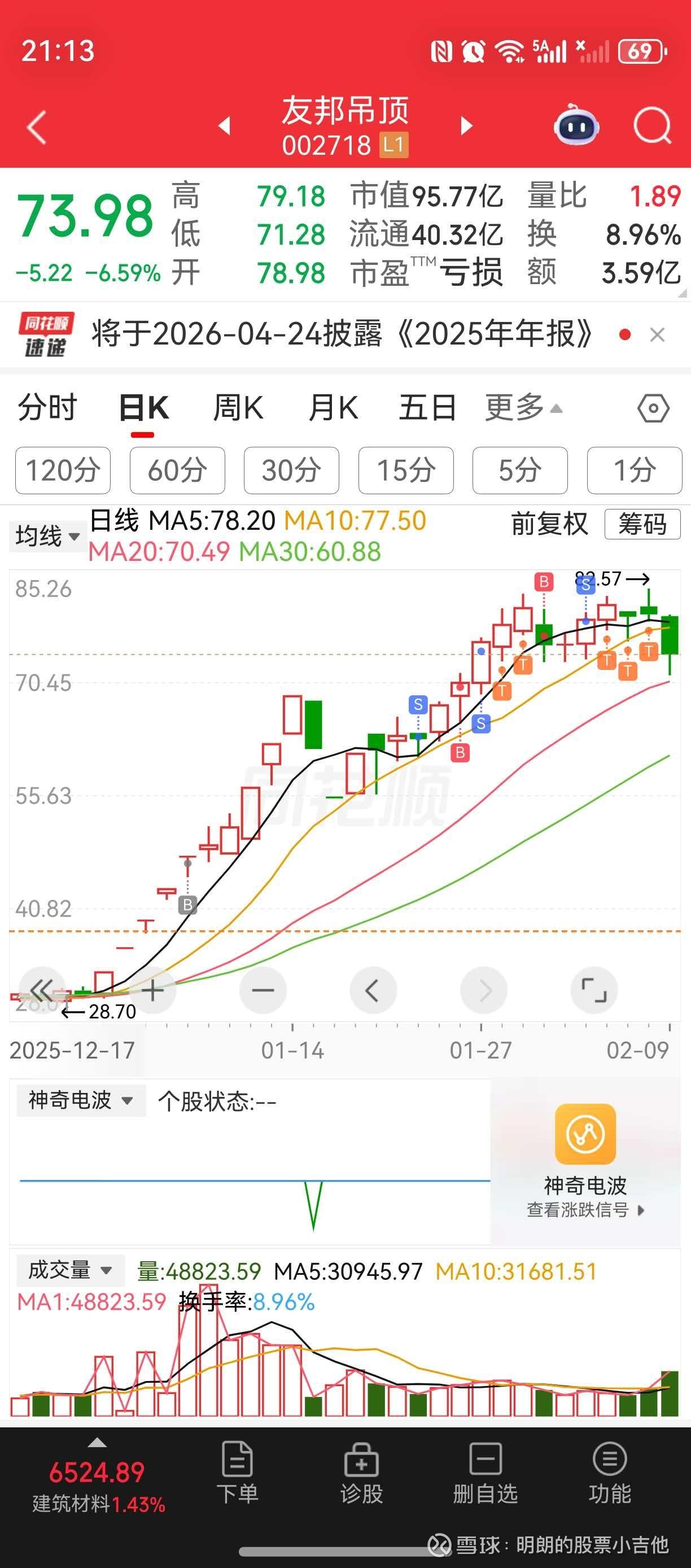 这个结果我知道总有一天会等来,但不知道会在今晚!天普我错过了……,友邦我无比珍惜!周末复盘帖子我说过很快结束震荡行情开始第二波拉升。今天还在反思小分时漏防没看到小分时已跌破80.83支撑位未拉回,这个点位没能及时发现,导致周五尾盘买入,今天打算拉起再做个T,哪知直接跌停跌穿76.5的支撑位,这是没能提前预判到的。今天尾盘拉起站上73.5,这个现象出现明天要回拉以上支撑位及78.78支撑位。天知道好消息来的如此美好!明天开始上面所有支撑位压力位将会永远被踩在山脚下,已经不再重要了!!!友邦是年线级别股!今年全市涨幅会是NO 1,没有之一!!!