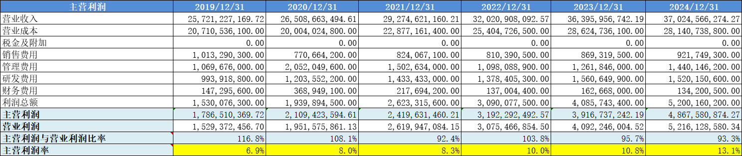 主营利润率同样出现逐步上升态势,2024年为13%;