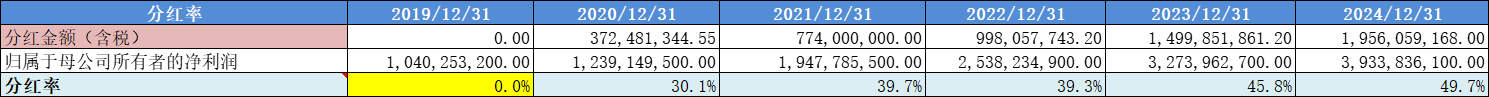 分红率稳步上升,2024年上升到了接近50%,分红能力和分红意愿都很好。