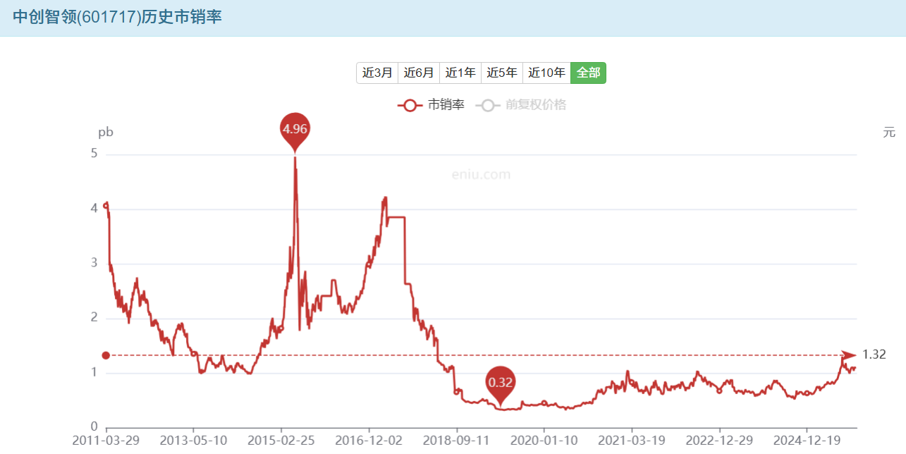 从市销率上看,低于0.5PS属于底部区域;当前估值较高;