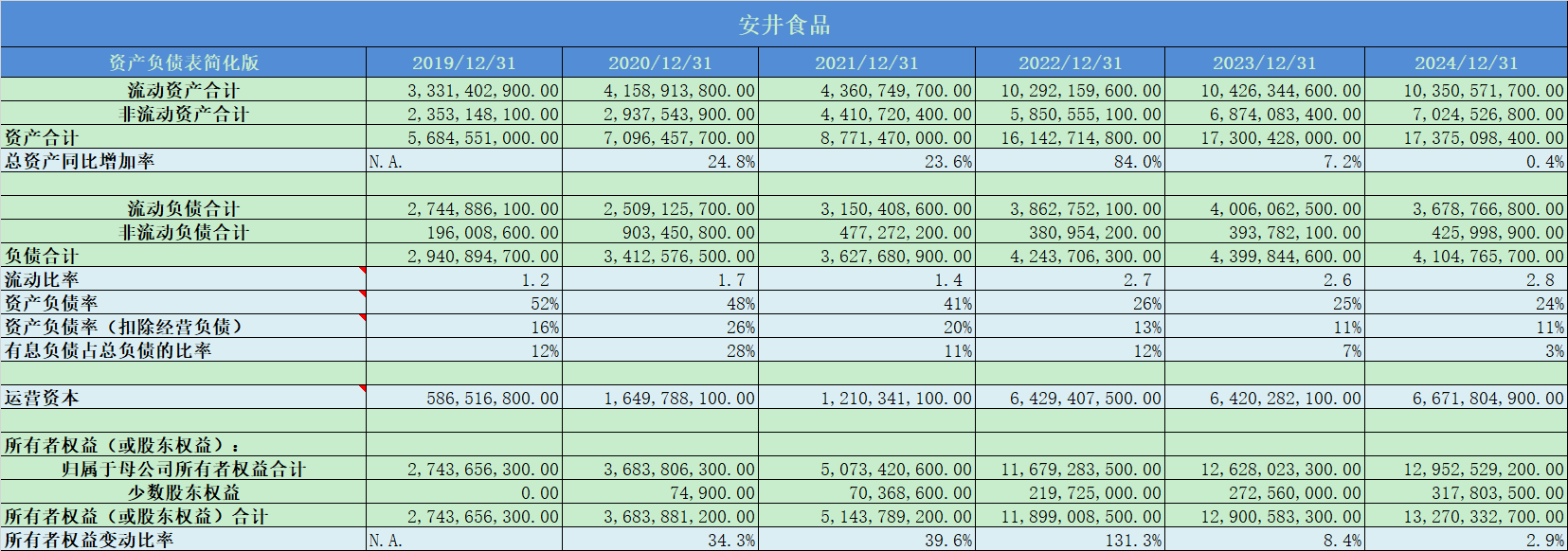 1. 安井食品的资产质量过硬,负债率极低,几乎没有有息负债;公司的经营负债占比13%,行业议价能力不错;流动比率非常高,账面现金流非常好。