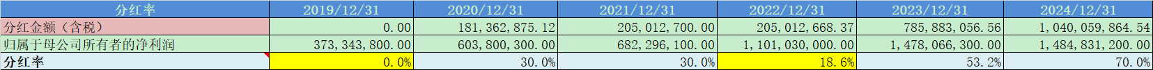 分红率波动较大,2024年提升到了70%,分红非常棒。
