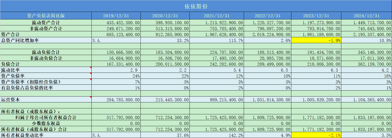 1. 依依股份的资产质量极其优秀,负债率极低,几乎没有有息负债,具有较好的行业议价能力,现金流非常优秀。