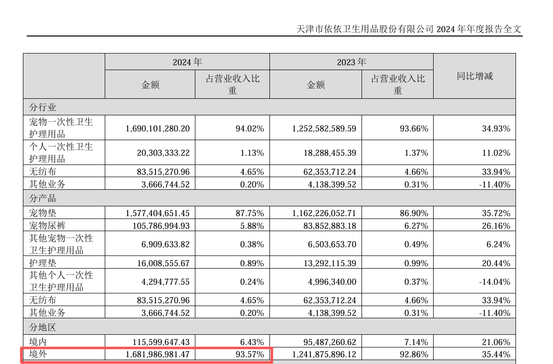 天津市依依卫生用品股份有限公司(股票代码:001206)成立于 1990 年,总部位于天津,是国内宠物卫生护理用品领域的龙头企业,也是 A 股首家上市的宠物卫生用品企业。公司专注于一次性卫生护理用品及无纺布的研发、生产与销售,产品涵盖宠物护理、成人护理、母婴护理三大板块,其中宠物护理用品占主营业务收入的 93.91%,是核心增长引擎。