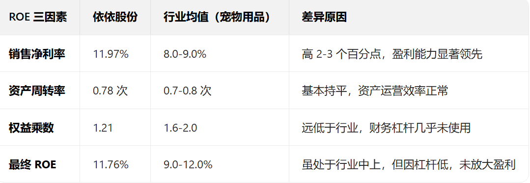 依依的 “销售净利率”(盈利能力核心指标)比行业高 2-3 个百分点,证明其产品竞争力、成本控制能力极强;ROE 偏低仅因未使用财务杠杆(负债少),而非盈利能力弱。