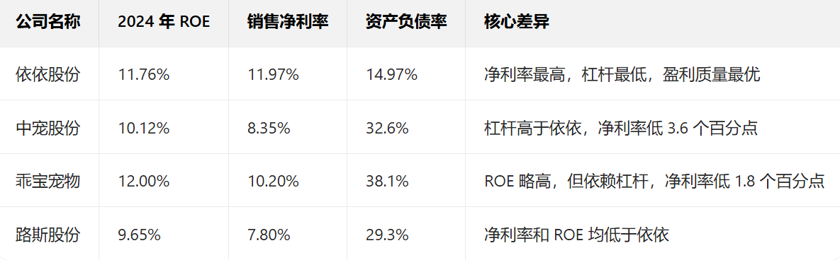 结论:判断盈利能力应聚焦 “毛利率、净利率、现金流”,而非单一 ROE;依依的盈利能力在宠物用品行业处于领先水平,10% ROE 是 “高质量的中等水平”,而非 “低盈利能力”。