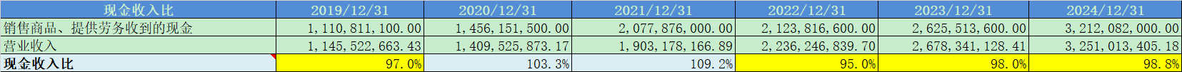 现金收入比平均值100%,收入质量很好;