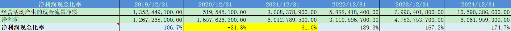 净利润现金比率2020-2021年不及格,2022-2024年表现优秀;