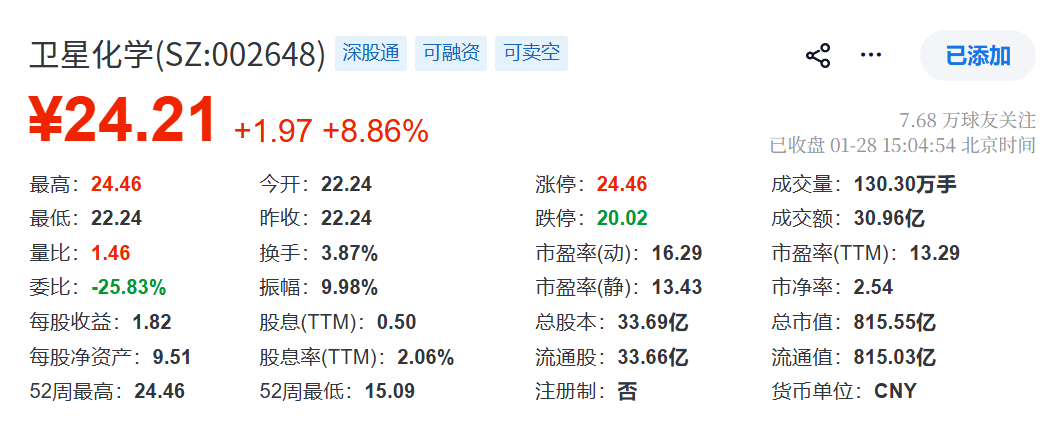 卫星化学股份有限公司是一家民营 “原创” 上市企业,总部位于浙江省嘉兴市,法定代表人为杨卫东。公司股票代码为 002648,于 2011 年 11 月 28 日在深圳证券交易所上市。公司自 1992 年开始创业,始终坚守 “化工让生活更美好” 的初心,秉持 “安全比利润更重要,把环保当成产品来做” 的核心价值观,坚持 “立足轻烃一体化,打造低碳化学新材料科技公司” 的发展战略卫星化学。