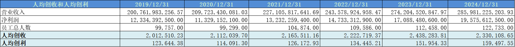 人均创收不错,但人均创利一般。