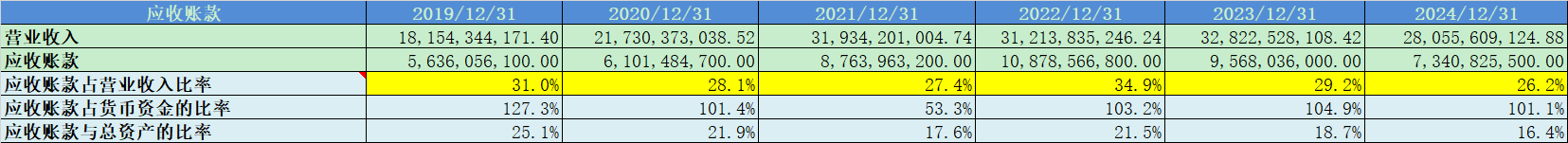 应收账款规模庞大:应收账款占总资产比重达 26%,处于极高水平,资金被大量占用,直接影响公司流动性与运营效率。