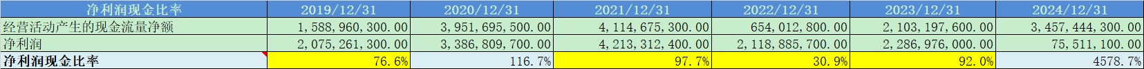 净利润现金比率大部分年份都在90%左右,个别年份表现一般;