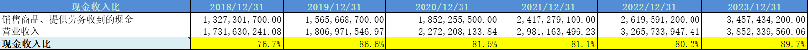 现金收入比长期小于90%,收入质量一般。