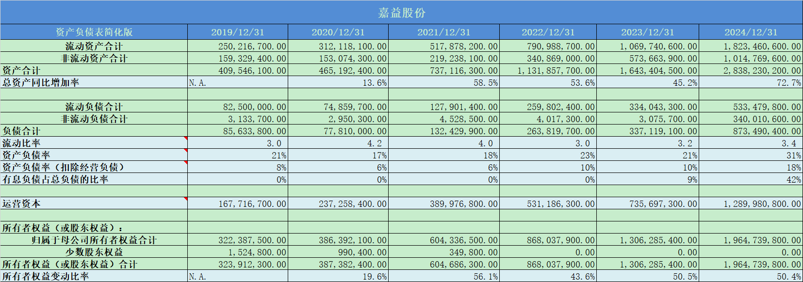 总体来看,嘉益股份的资产质量很好,负债率较低,流动比率优秀,总资产增速非常快,基本面良好;