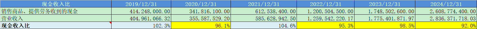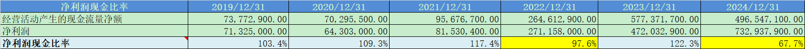 净利润现金比率平均值101%,现金含量不错;但2024年只有67%,含量出现大幅下滑;