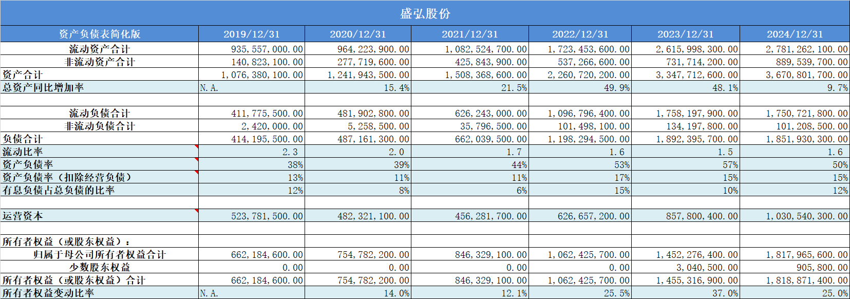 1. 盛弘股份的资产质量非常高,负债率极低;经营负债占比很高,行业议价能力很好;流动比率表现良好;公司总资产增长速度很快;