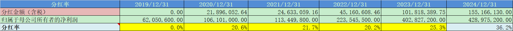 2020-2023年的分红率20%+,2024年大幅提升到了36%,整体回报稳定良好;