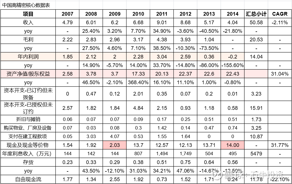 从前表中,可以看出中国高精密的经营可分成二个阶段,2007-2013年的盈利阶段。2014-2013年的经营亏损阶段。我们按这个时点来拆解数据如下。