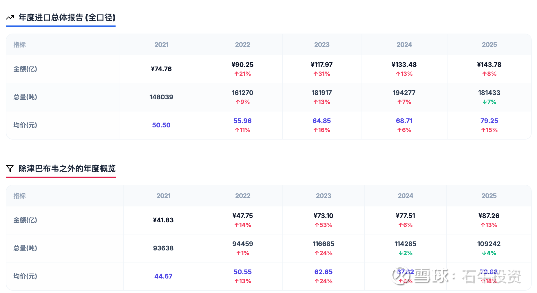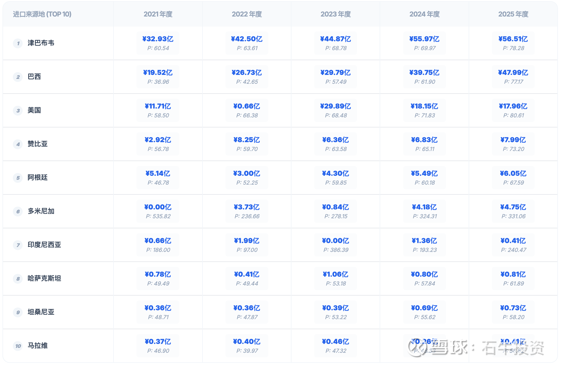 1、2021-2025年进口金额趋势:2025年比2024年增长8%。除津巴布韦外增长13%。