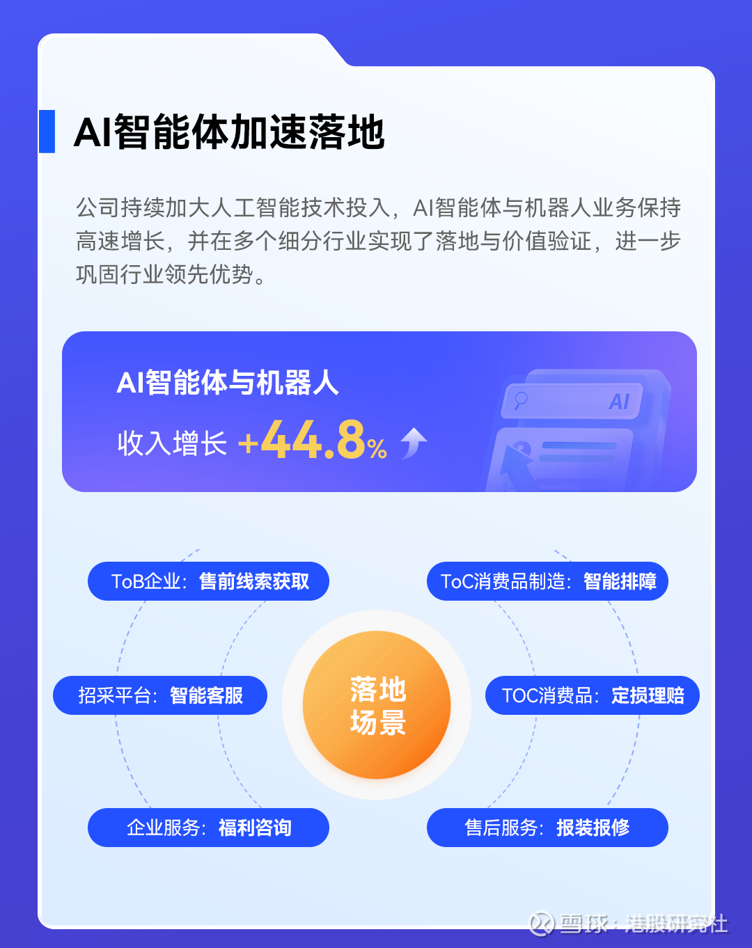 目前,天润云AI Agent相关产品已成功在消费电子、商业连锁、家居家电、软件服务及工业设备等多个行业的企业客户中落地应用,AI收入也因此实现了44.8%的同比增长。同时,超过三分之一的新签约客户选择了AI员工,我们相信其场景化应用将进一步加速。