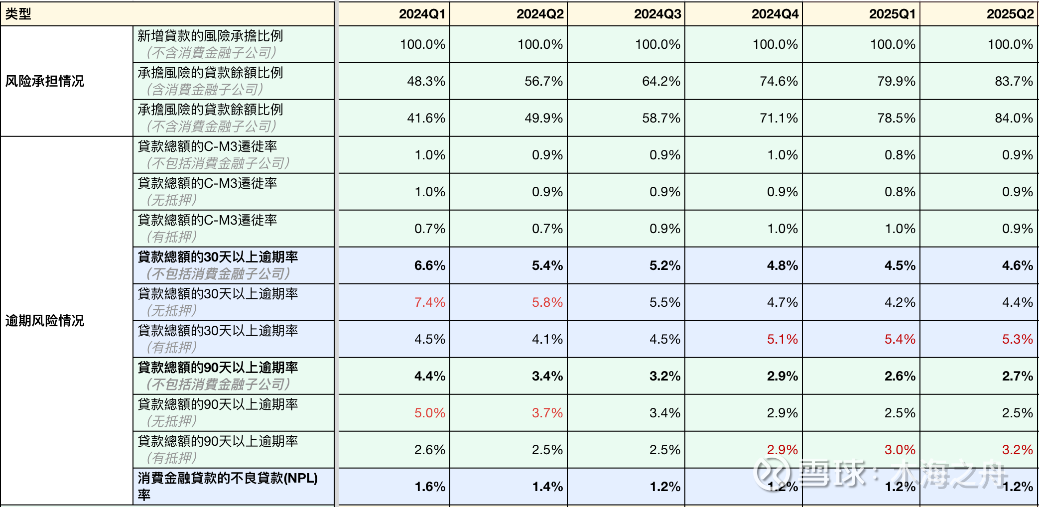 *备注:由上表可看到,25Q1应该过去一段时间资产质量最好的一个Q(C-M3=0.8% | 90D逾期率 = 2.6%),大概还剩16%贷款余额需要转全担保,消费贷NPL持续稳定在1.2%。