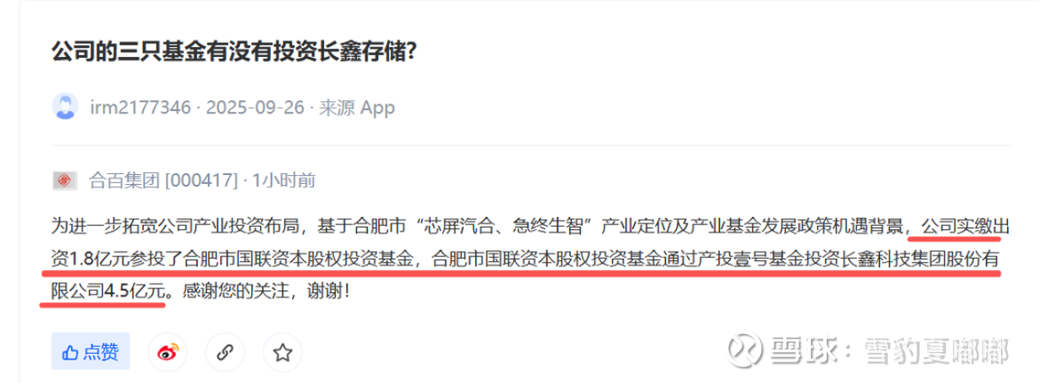 合百集团在互动平台确认,公司实缴出资1.8亿元参投了合肥市国联资本股权投资基金,而该基金通过产投壹号基金投资长鑫科技集团股份有限公司4.5亿元。这一投资架构显示,合百集团通过多层嵌套的基金方式,间接参与了长鑫科技的股权投资。