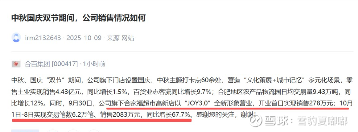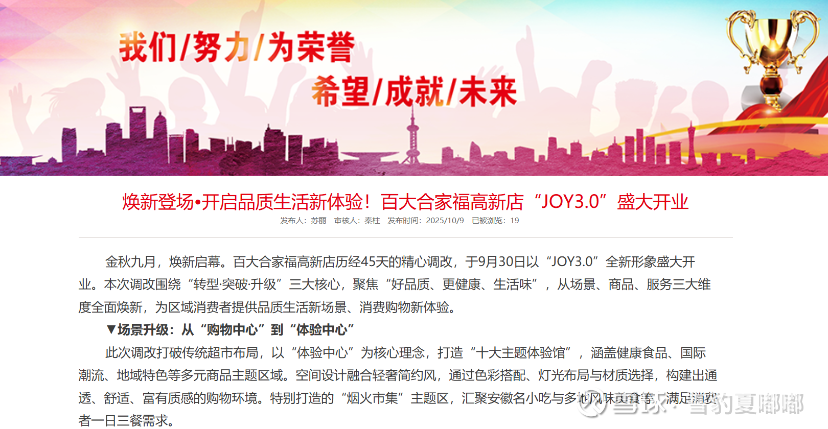 旗下合家福超市高新店以“JOY3.0”形象开业,首日销售278万元,101日-8日销售同比增长67.7%。该门店引入“谷子经济”(二次元周边)专区、智能购物车等创新场景,验证了年轻客群消费潜力,为后续门店改造提供模板。