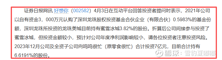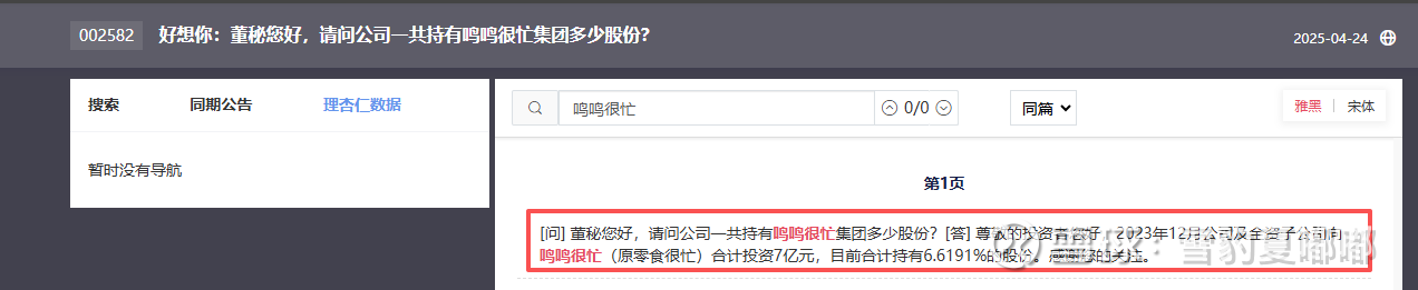 值得关注的是,市场此前普遍存在信息偏差,好想你并非仅通过河南好想你悠然参股1.8%,而是合计持有鸣鸣很忙6.6191%的股权。(互动回复);查到的是3.6%;