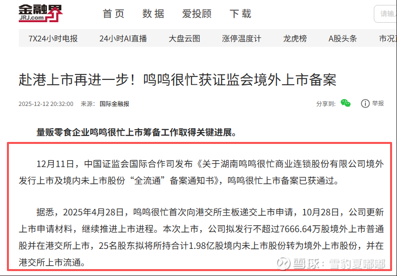 12月11日,中国证监会国际合作司正式发布鸣鸣很忙境外发行上市及境内未上市股份“全流通”备案通知书,标志着鸣鸣很忙赴港上市的国内监管关卡已全部打通。