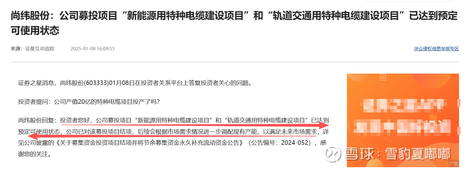 据2025年1月8日互动易回复,公司募投项目“新能源用特种电缆建设项目”和“轨道交通用特种电缆建设项目”已结项,达到预定可使用状态。产能释放将为公司在新能源、轨道交通等市场的订单获取提供有力支撑。