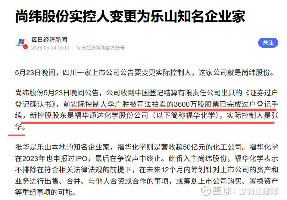 2025年5月24日,公司发布公告,控股股东变更为福华通达化学股份公司,实际控制人由李广胜变更为张华,福华化学持有公司25.35%股份。