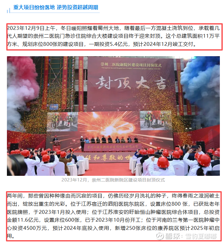 在资质与产能布局方面,公司旗下泗阳医院东院区成功获得老年医院牌照,补齐专业老年医疗服务资质短板;兰考第一医院同步启动康养院区建设,规划250张医养结合床位,进一步扩充医养服务供给。