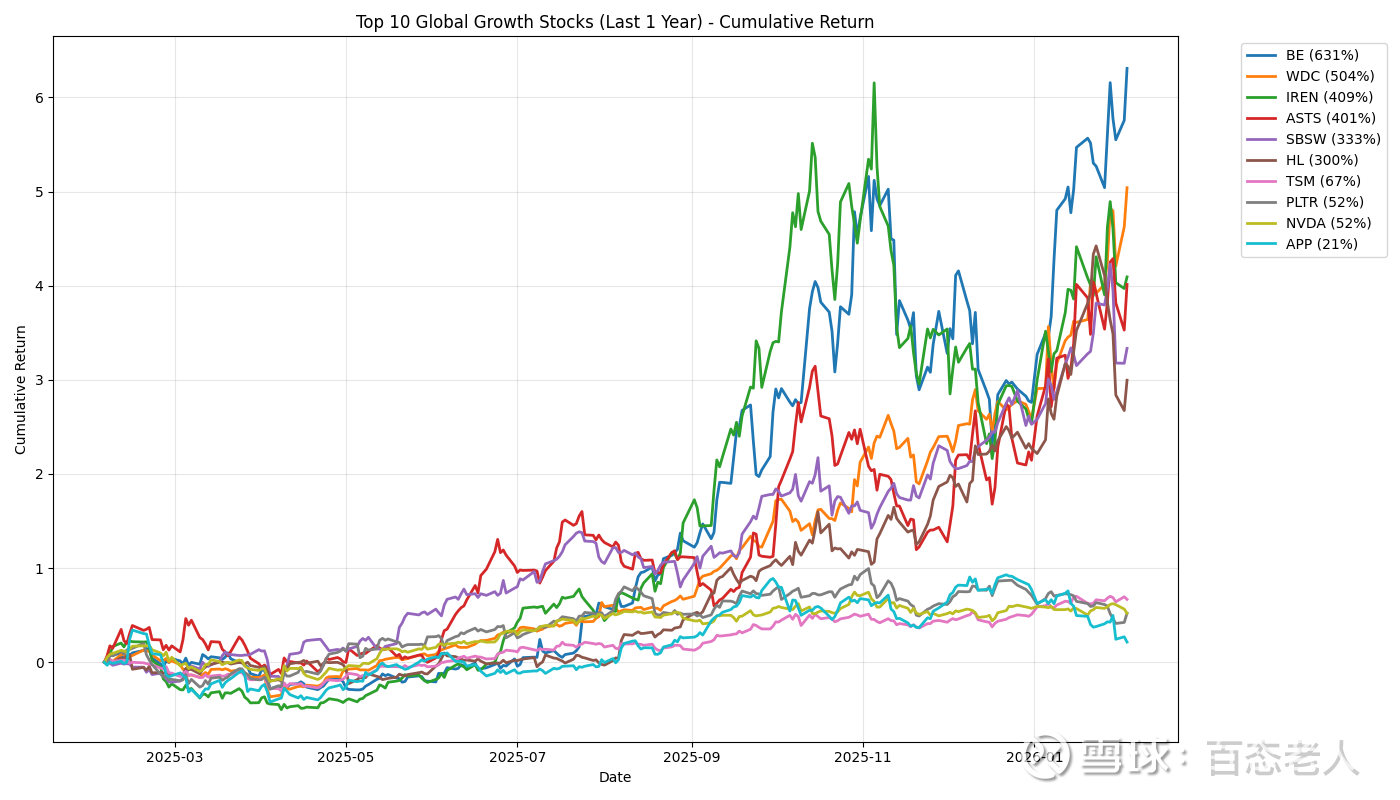 我们筛选了全球市场中极具代表性的高增长股票,绘制了过去一年的趋势图。