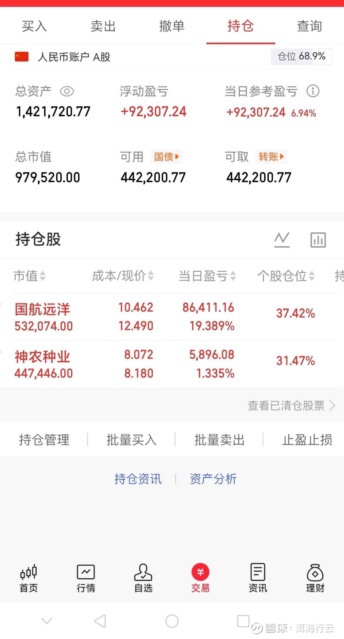 持股:国航远洋,神农种业。外围冲突,早上出击低吸了国航远洋和神农种业,表现还可以。市场今天表现是超预期的,没有太大的负反馈,挺直脊梁,没有交军费,三月开门红。持股仅作为模拟操作,不作为投资依据。$国航远洋(BJ920571)$ $神农种业(SZ300189)$