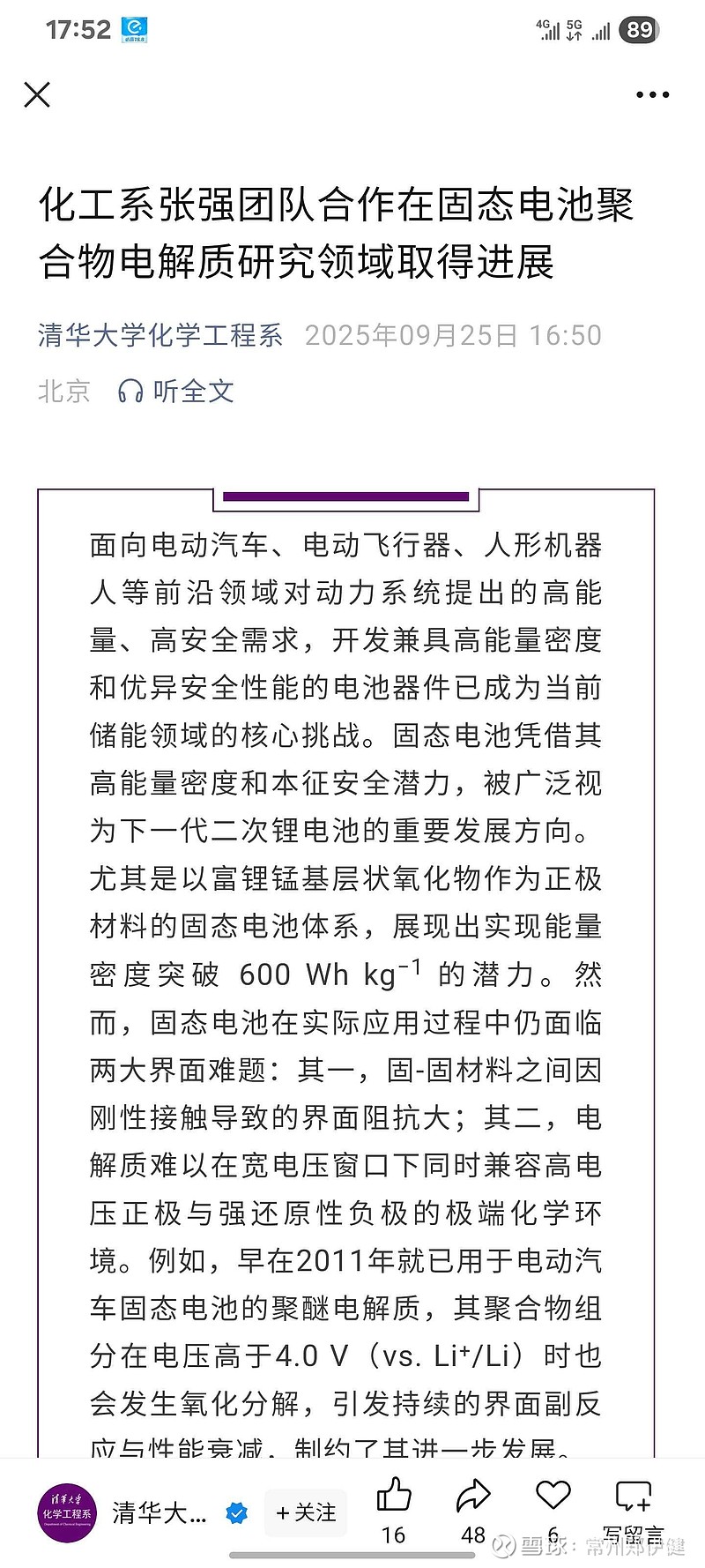 此外,清陶能源(由清华大学教授南策文团队创立)虽为固态电池领域头部企业,但其合作方主要为翔丰华(300890)、利元亨(688499)等材料及设备供应商,未直接提及与清华大学化工系的合作。