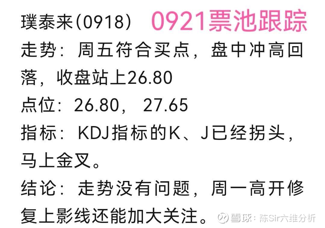 但技术面不是一成不变的,它会随着走势的发展不断变化,需要每天跟踪分析你才能更好的把握它。现在没到买点不代表后面不会有,而你再看好一个股也要服从客观走势,一旦走坏,信号出来该离场就要离场。
