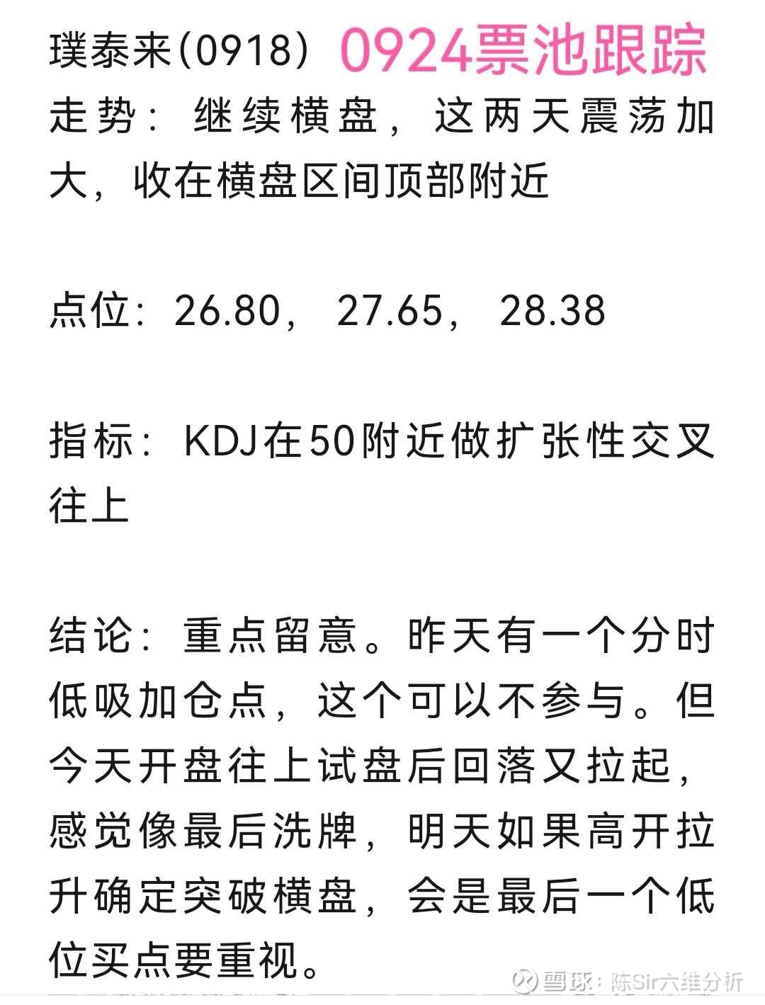 后面连续3天都是冲高回落,继续洗盘。这个位置是最容易被震下车的,有做T拿着会舒服一点。其中0926是回落最多的,指标也有反应,在周末也强调了一下如何应对。