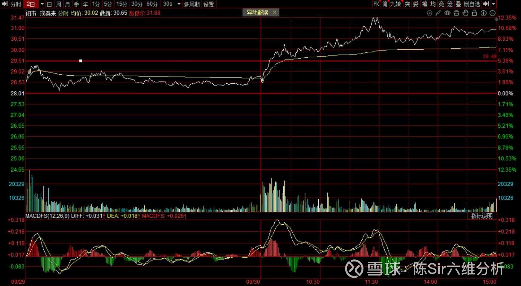 0930节前终于迎来一根攻击大阳。其实当天是有一个分时背离卖点,如果利润垫不够这里是一个减仓点。那时候已经有些离开我的成本区,加上比较看好所以没动,拉升时我把减仓点设为0929的高点,背离后改为分时均线,后面没有跌破所以拿住了。