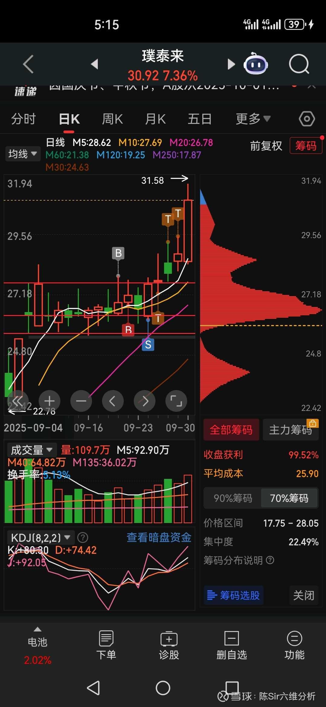 4,日内T的前提是日线走势没有明显问题。如果股票到了关键位置,尽量不要随意去T,这时候先手权更加重要。