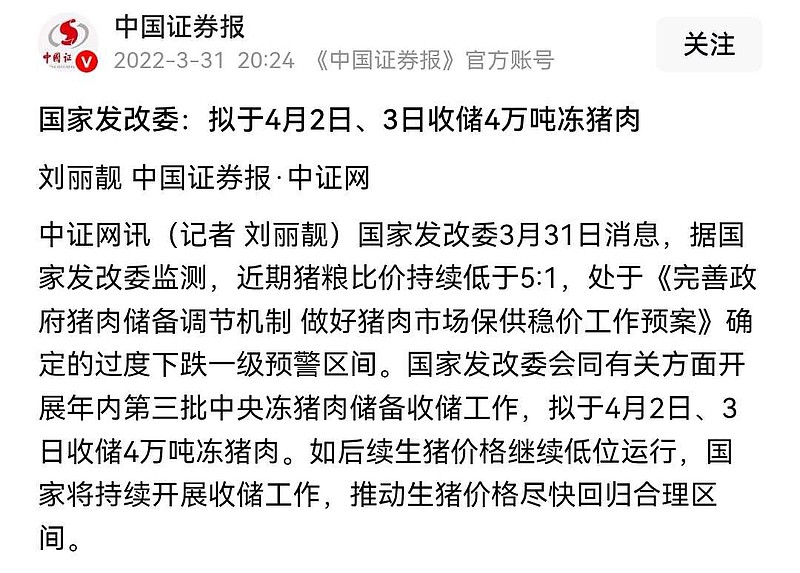冻猪肉加大收储力度,目前看到权威的报道是4万吨;还有一说15万吨,但没有查到权威报道。