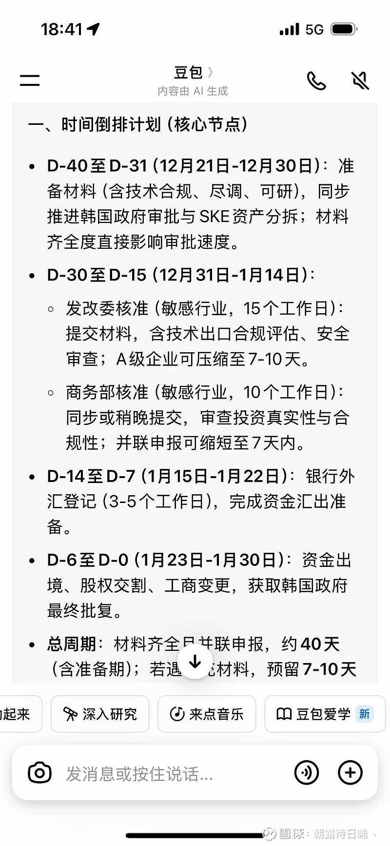 $聚和材料(SH688503)$ 豆包给的ODI审核时间表是韩国审核完成后,才递交发改委审核,发改委审核通过后,商务部审核,然后银行外汇汇出。如果按这个时间表算,1月20日韩国审核完毕,现在应该还在发改委审核中,审核完成要到春节后了。