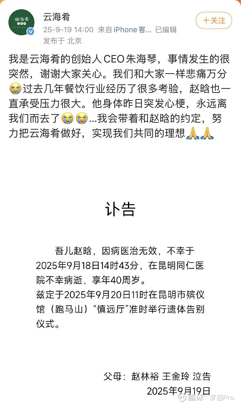 #云海肴创始人赵晗去世# #赵晗遗体告别仪式明天举行# #云海肴# $海底捞(06862)$ $九毛九(09922)$ $美团-W(03690)$