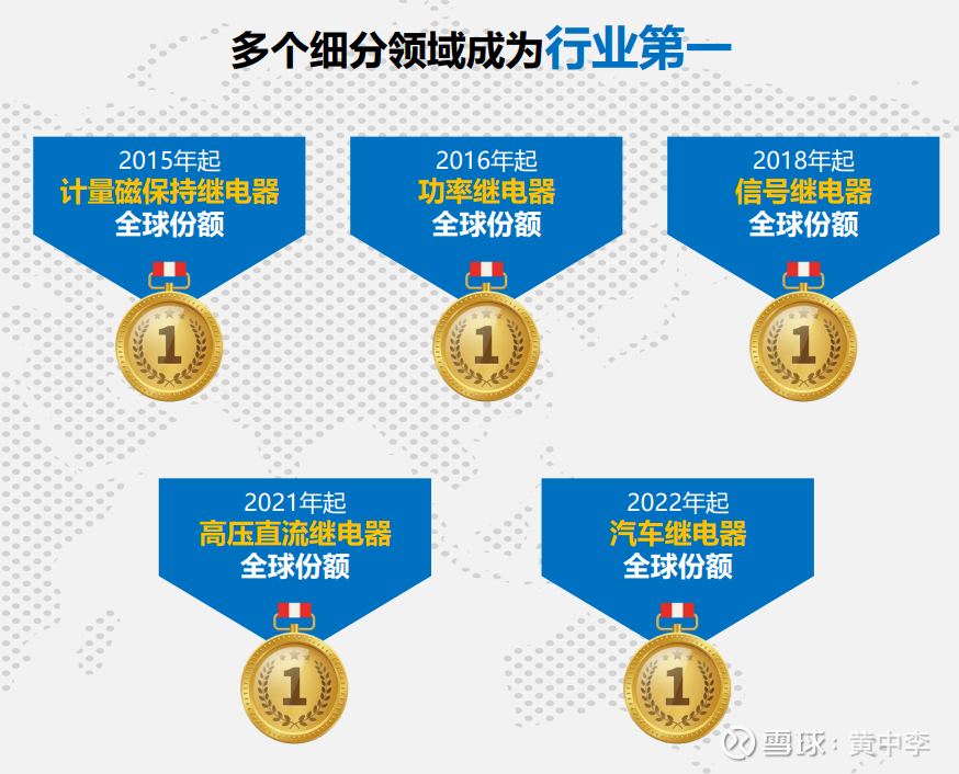 丙、公司分产品的全球市占率情况。根据公司的2022年度可持续发展报告,公司多个细分领域的继电器排名世界第一。如下图所示。