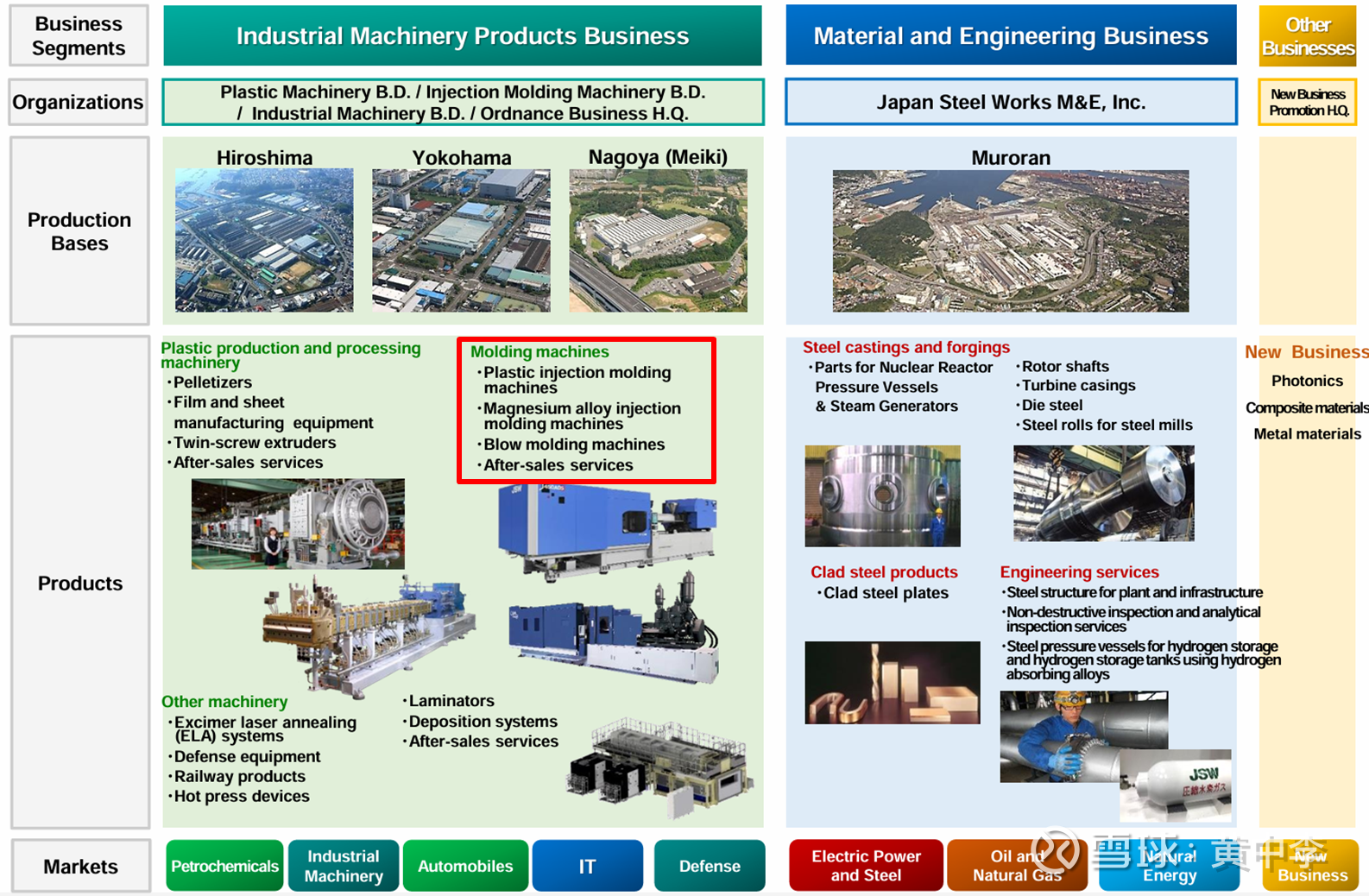 工业机械业务部门又包括4块:①Plastic production and processing machinery(树脂机械);②Molding machines(模压设备,日文为成形机);③Defense equipment(军品);④Others(其他)。