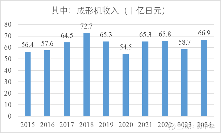 2024财年,公司总收入2450亿日元,其中工业机械收入1990亿日元,占绝对多数。更细拆,成型机收入669亿日元,占公司总收入的27.3%,仅次于树脂机械的722亿日元,堪称是公司的核心业务之一。这和上一篇的住友重工的情况完全不同。