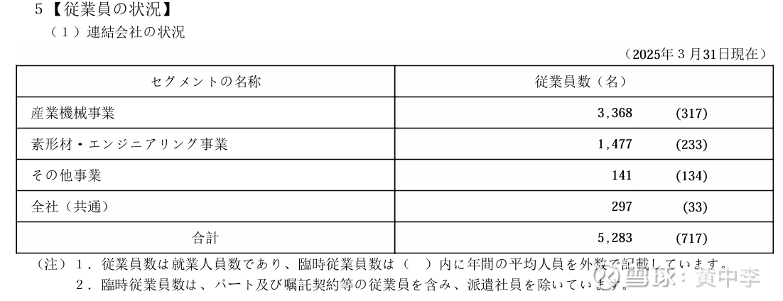 2024财年工业机械部门的员工数量计算如下:不计算临时工数量;假设总部297名员工中有200名计入工业机械部门,再加上产业机械事业的3368名员工,合计为3568名员工。
