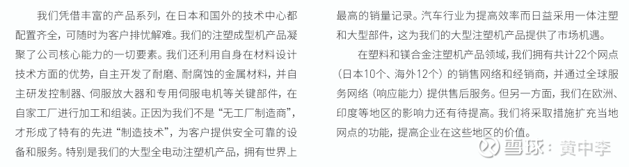 ①收入体量尚能保持但市场份额持续萎缩;②在日本市场竞争力较强,但海外运营能力不足;③研发投入不足,有吃老本的嫌疑;④特色产品是全电动大型注塑机和镁合金注射成形机;⑤盈利能力尚可接受。